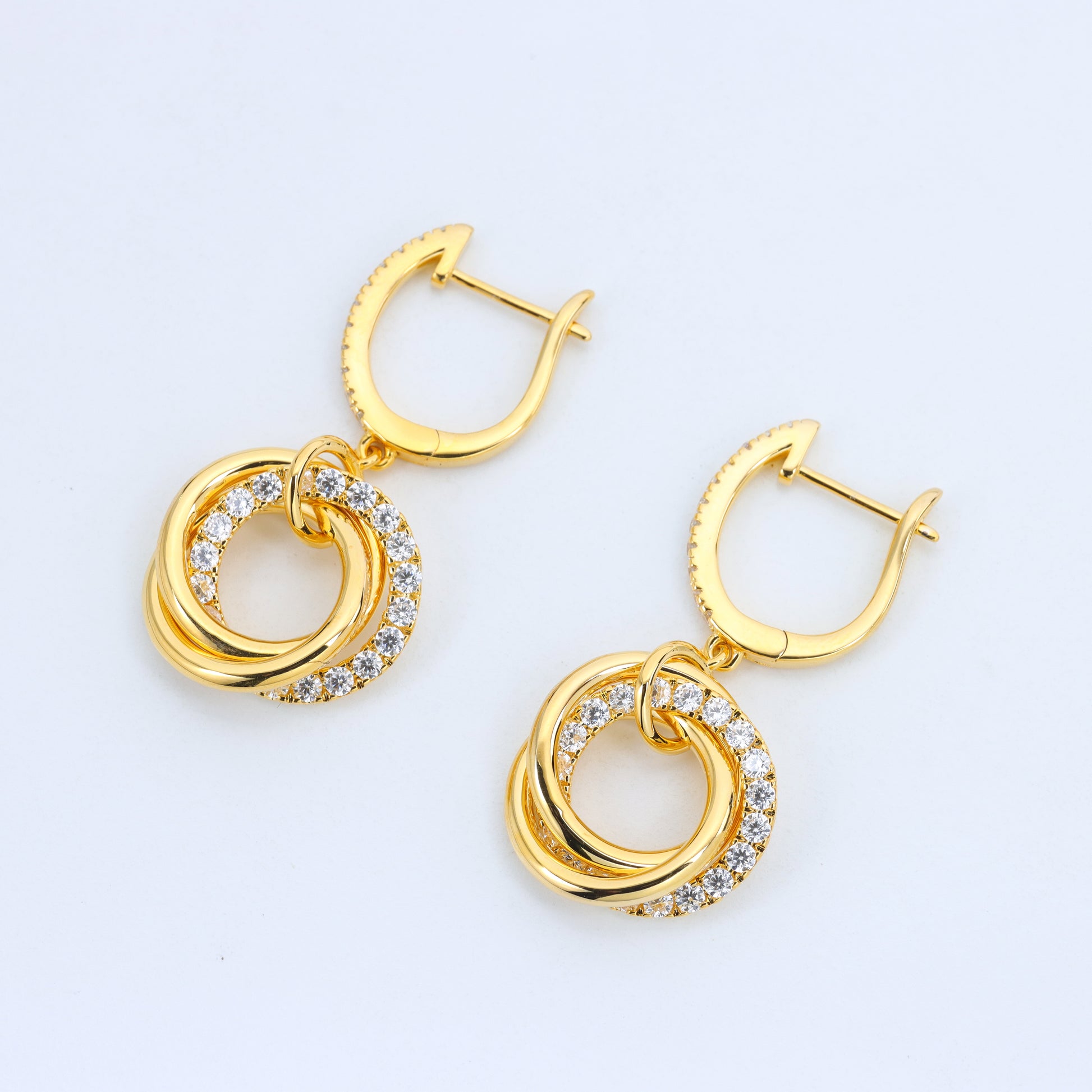 These 24K gold-plated zircon hoop earrings feature a stunning design of triple interlocking rings, exuding both modern elegance and classic sophistication. The rings are adorned with sparkling zircon stones, creating a dazzling effect with every movement. The shimmering stones reflect light beautifully, enhancing the earrings' luxury feel.