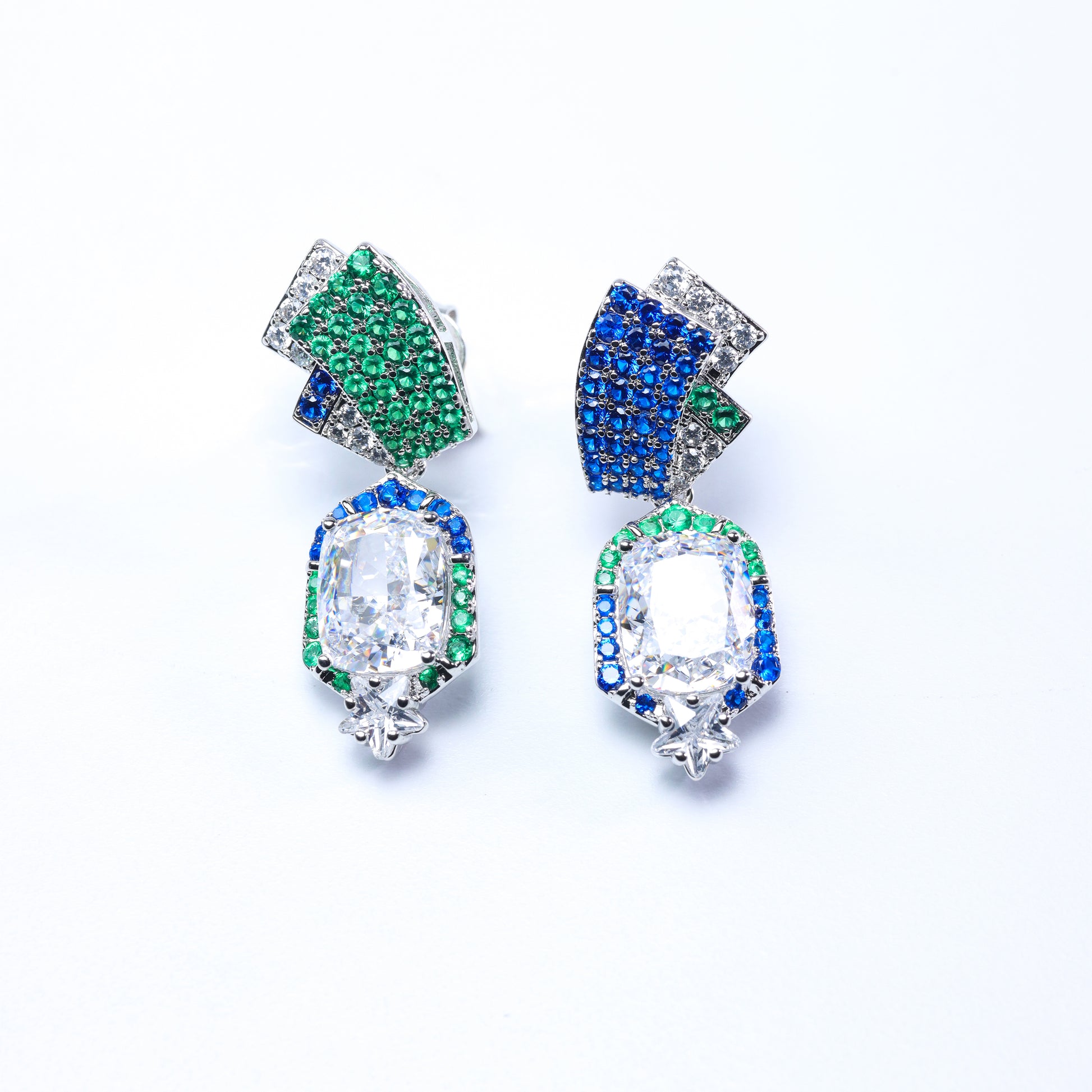 Stand out with these bold and modern asymmetrical earrings, crafted with 24K gold plating and adorned with sparkling zircon stones. Designed with a unique mix of blue and green lab-created gemstones, the earrings bring a playful yet luxurious touch to your look. At the bottom, each earring features a dazzling 3-carat princess-cut zircon that catches the light beautifully, adding a brilliant sparkle. The asymmetrical design makes these earrings a statement piece, perfect for fashion-forward individuals who love to express their unique style.