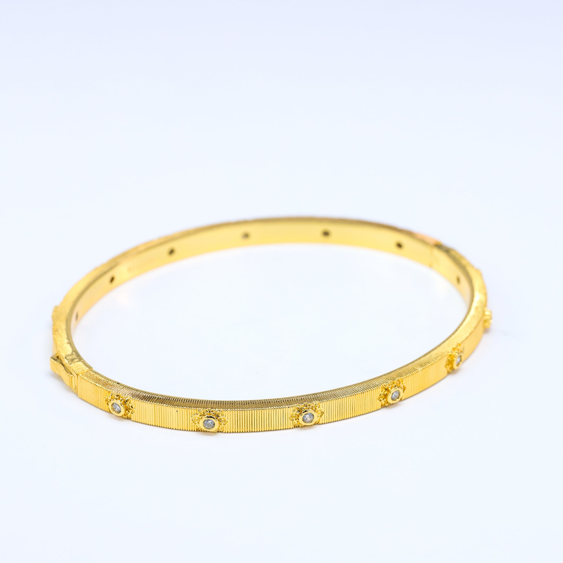 Timeless elegance meets modern craftsmanship in this 24K gold plated bangle. The sleek design is highlighted with delicate zircon accents, while the metal surface is crafted with a vintage brushed finish that adds depth and sophistication. This bangle combines minimalism with luxury, making it the perfect piece to wear on its own or stack with other bracelets. Whether for everyday elegance or special occasions, this bangle is a versatile and stylish choice.