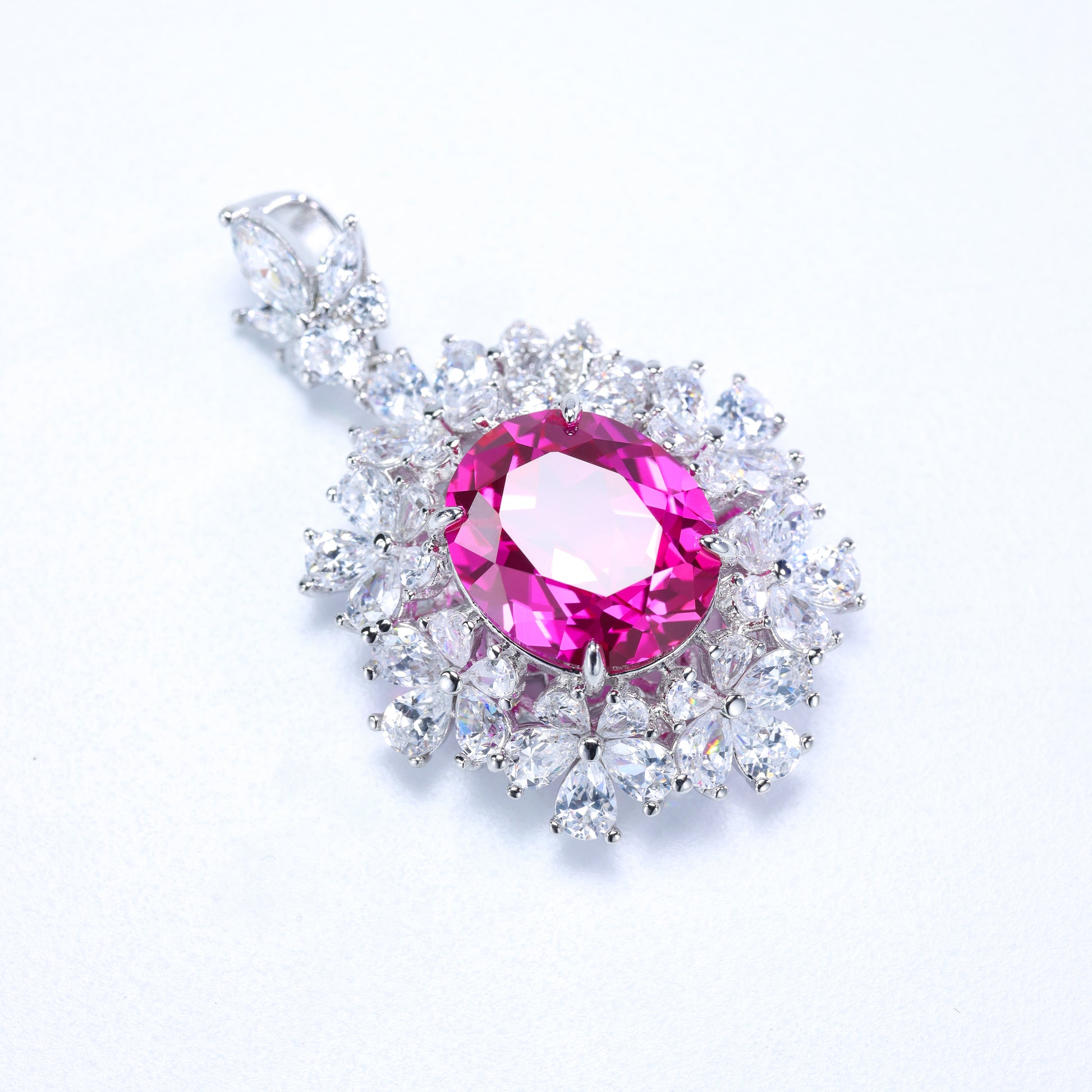 Make a bold statement with this exquisite 24K gold plated pendant, featuring a stunning oval-cut lab-created pink gemstone at its center. Surrounded by radiant zircon stones, this pendant captures light beautifully, creating a luxurious and eye-catching effect. The intricate design makes it a perfect accessory for both special occasions and everyday elegance. Please note: the pendant only is included; chain is not included.