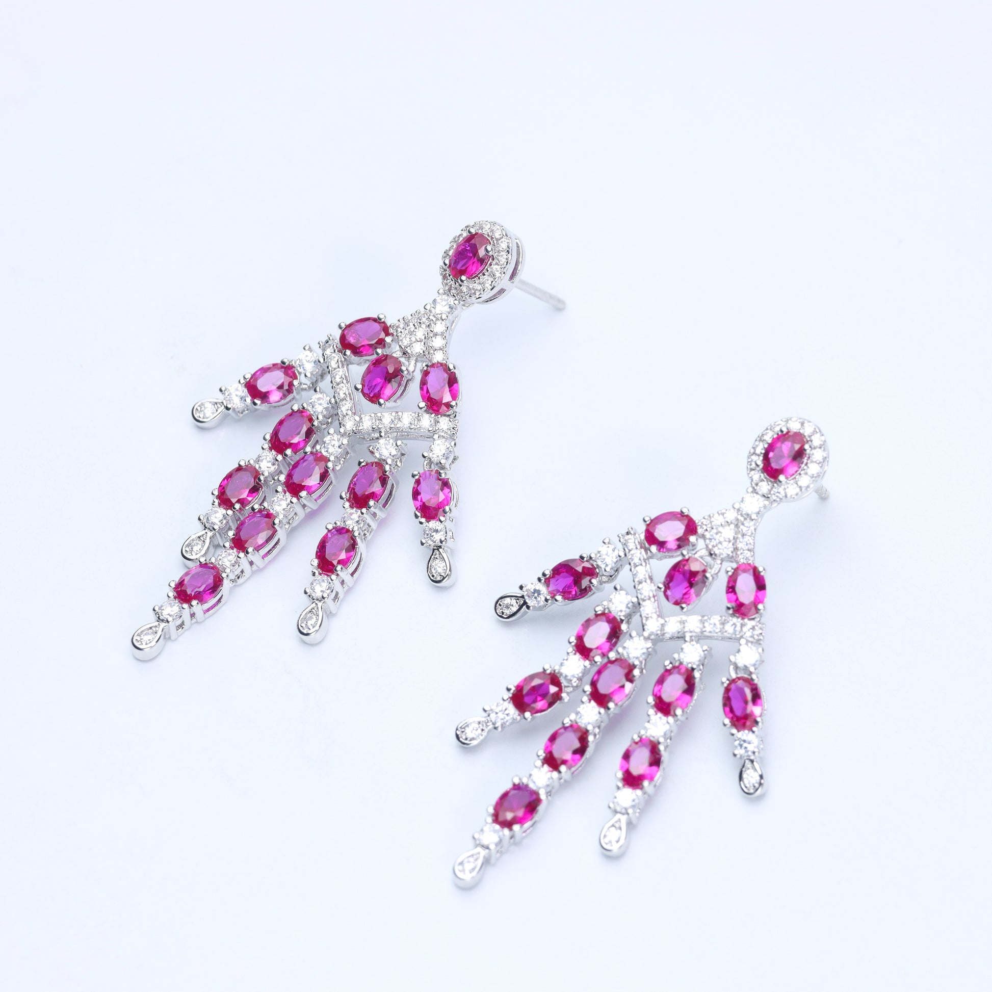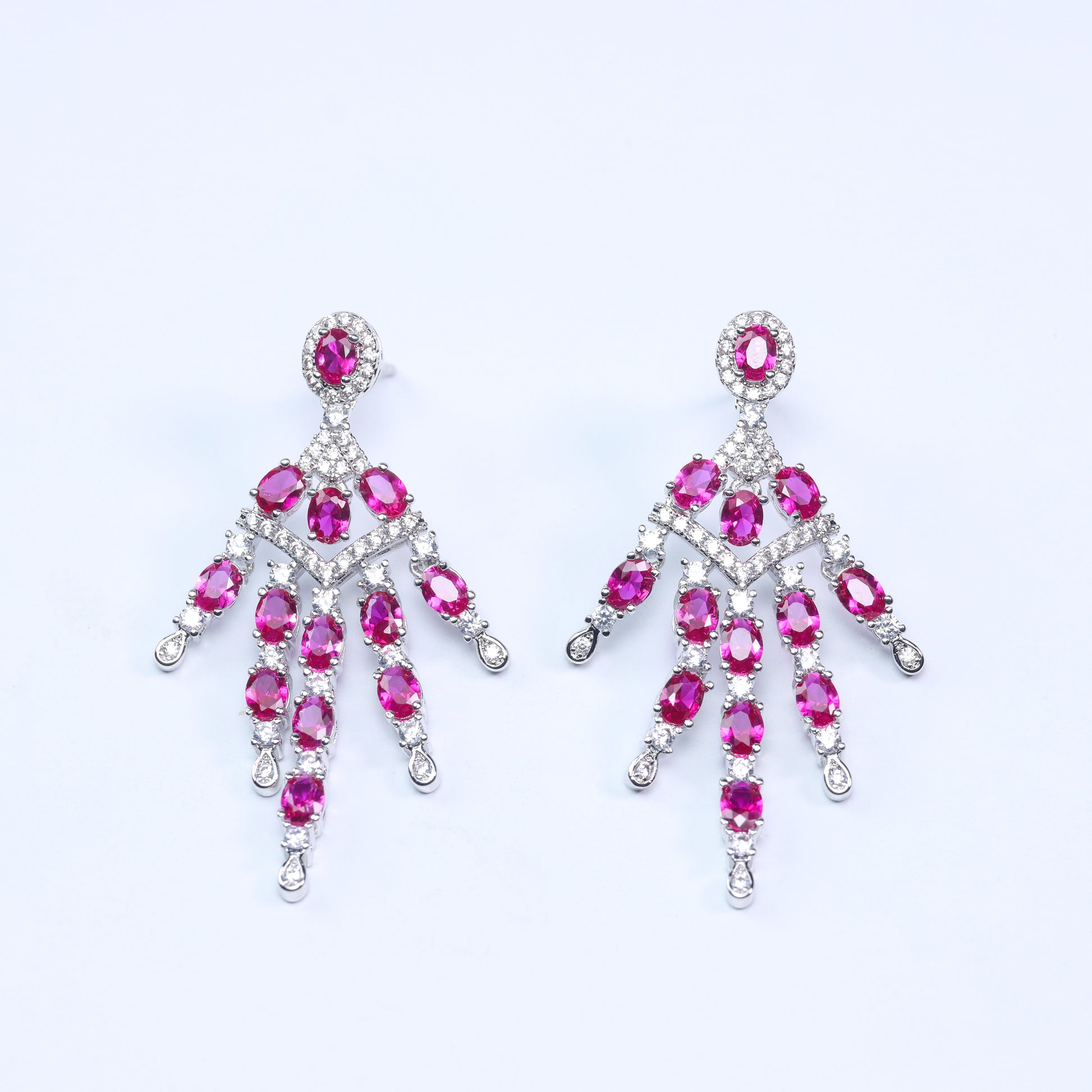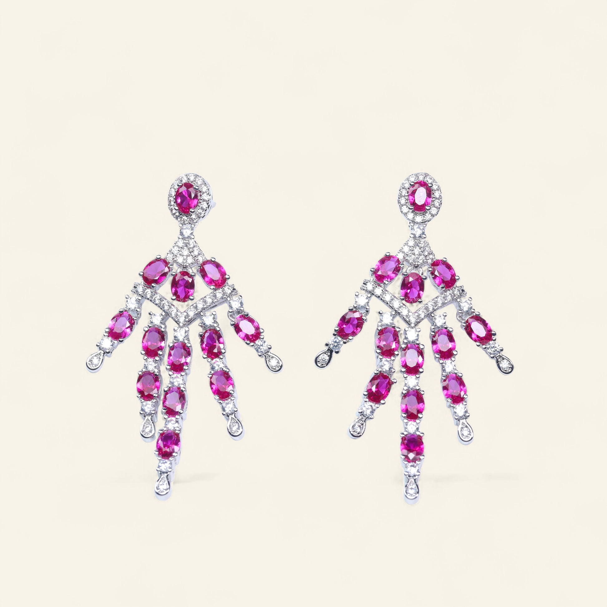Elevate your elegance with these exquisite cascade earrings, crafted with a 24K gold-plated base and intricately set with sparkling zircon stones. The striking red gemstones are premium lab-created rubies, radiating passion and sophistication. Designed in a chandelier-inspired style, the earrings flow gracefully, catching the light with every movement, making them the perfect choice for glamorous evenings, weddings, or special celebrations.