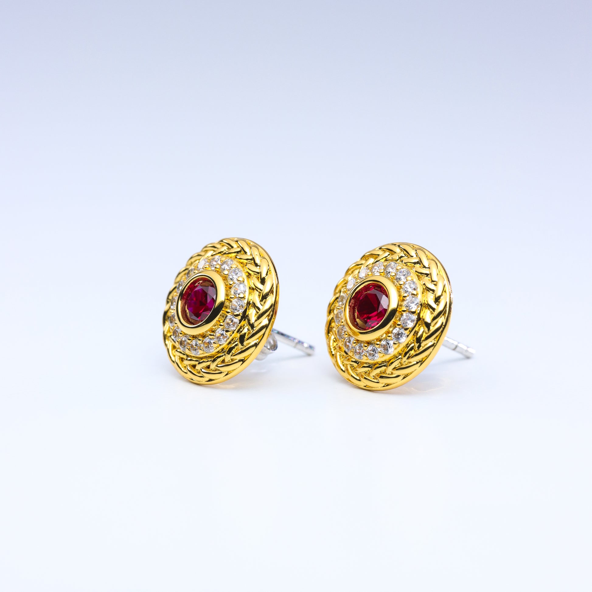 Enhance your style with these elegant 24K gold plated earrings, featuring a radiant lab-created ruby at the center. Surrounded by a circle of sparkling zircon stones and framed with a woven gold design, these earrings combine timeless sophistication with modern craftsmanship. The vibrant red gemstone adds a bold touch of color, while the zircon halo ensures a dazzling shine. Perfect for both everyday wear and special occasions, these earrings are a refined addition to any jewelry collection.