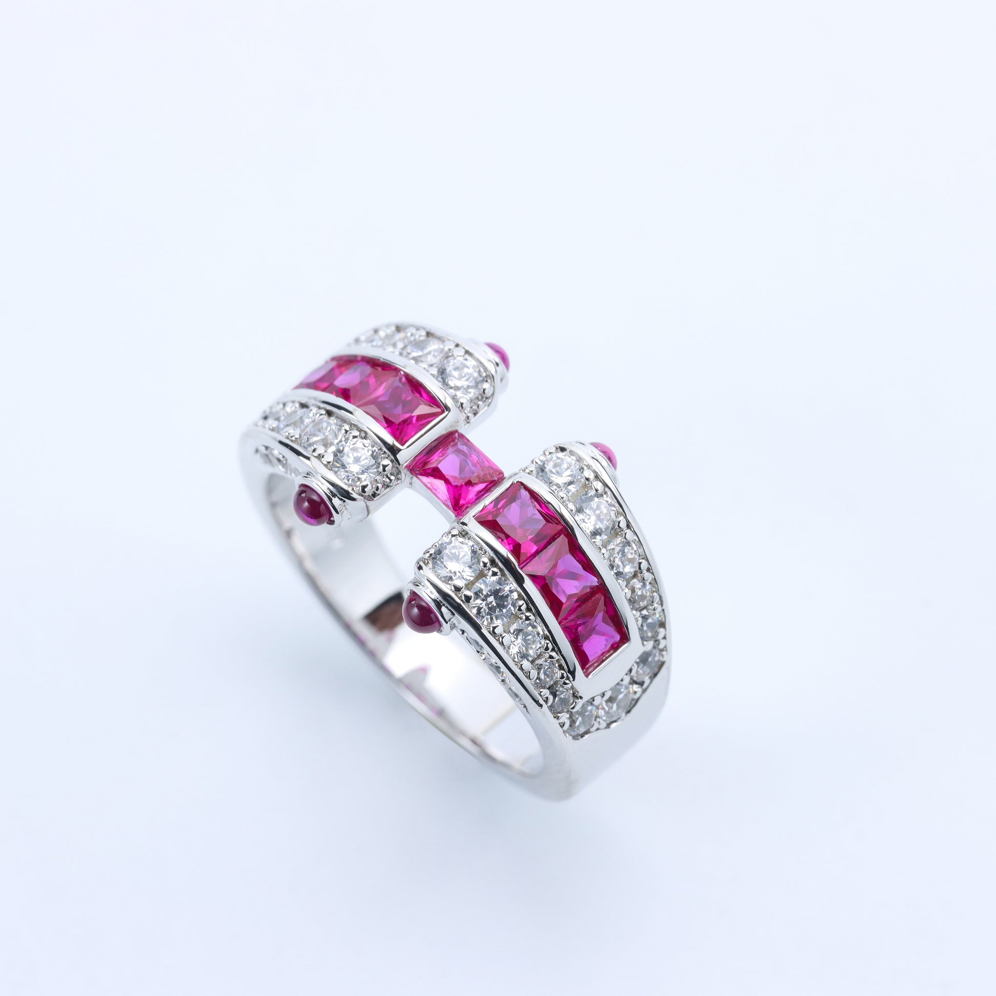 Make a bold and glamorous statement with this exquisite ruby and zircon ring. Crafted with a 24K gold-plated finish, the ring features brilliant pavé-set zircons surrounding vibrant synthetic rubies, creating a dazzling contrast of fire and brilliance. The geometric design adds a touch of modern sophistication, while the rich red tones of the rubies symbolize passion and elegance. Perfect for evening wear, special occasions, or as a standout piece in your jewelry collection.