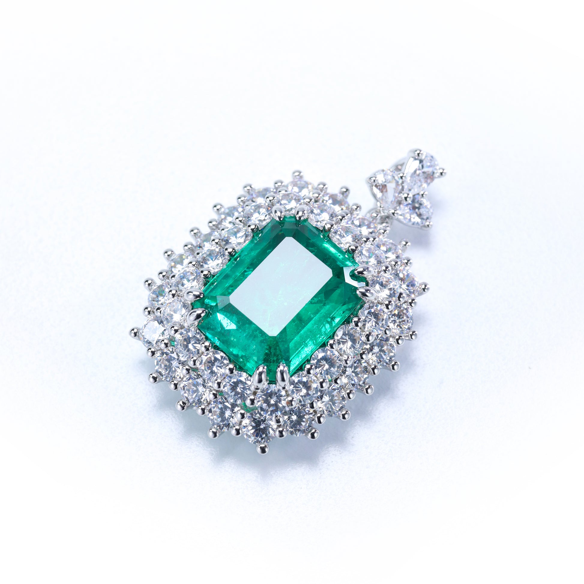 Luxurious Centerpiece: A striking princess-cut lab-created emerald sits at the heart of the pendant, offering a vivid green brilliance.
