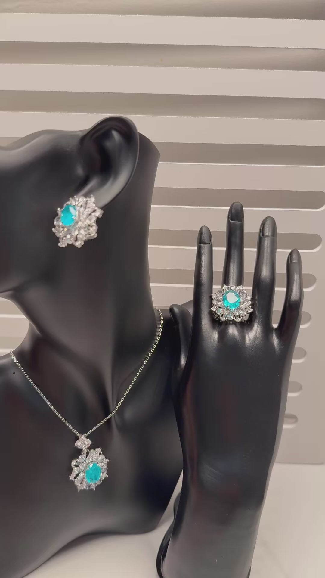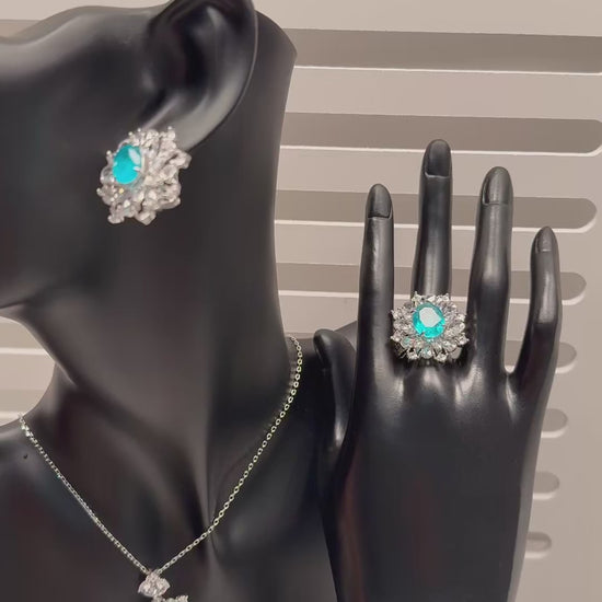 Gemstones: Synthetic paraiba tourmaline center with cubic zirconia accents