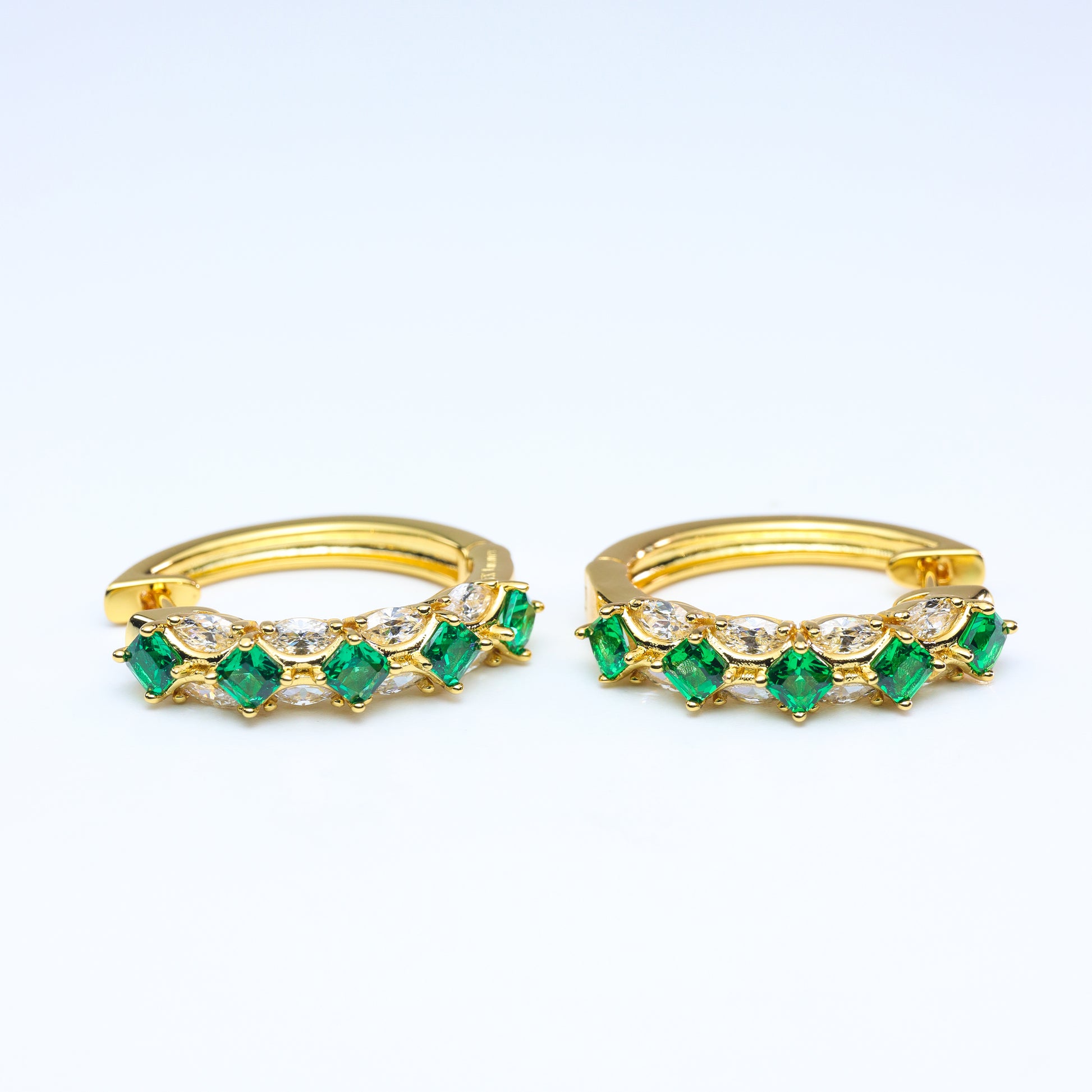 Add a vibrant touch of elegance with these 24K gold plated hoop earrings, beautifully set with alternating lab-created emerald gemstones and sparkling zircon stones. The brilliant green hue of the emeralds pairs perfectly with the dazzling white zircon, creating a striking contrast that radiates luxury. Designed for both everyday wear and special occasions, these earrings bring timeless sophistication and a pop of color to your jewelry collection.