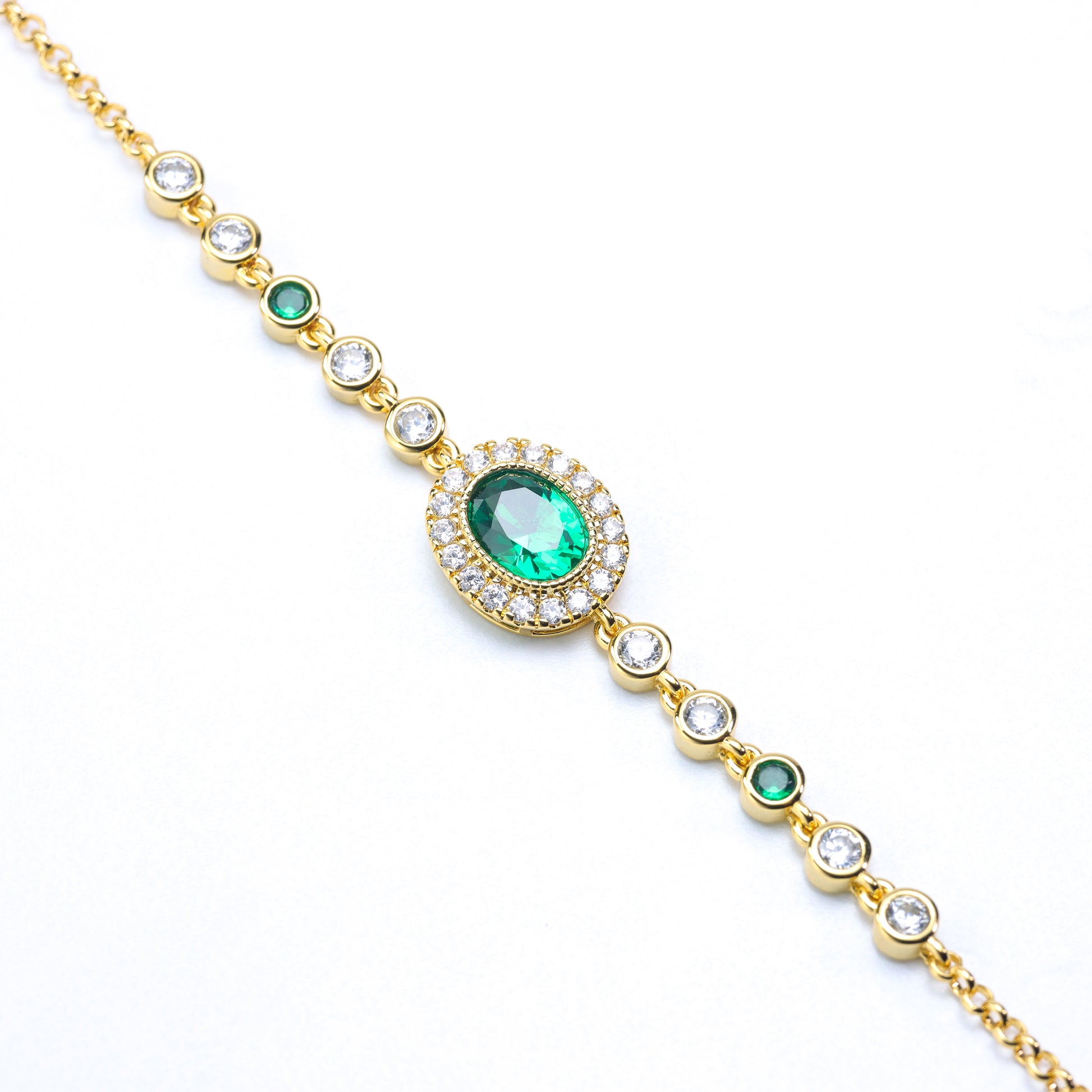 Elevate your elegance with this stunning 24K gold plated bracelet, featuring a brilliant oval-cut lab-created emerald as its centerpiece. Surrounded by sparkling zircon stones, the vibrant green gemstone radiates timeless charm and luxury. The bracelet’s delicate chain is adorned with alternating emerald and zircon accents, adding a touch of refinement to its design. Perfect for special occasions or as an everyday statement piece, this bracelet combines sophistication with modern elegance.