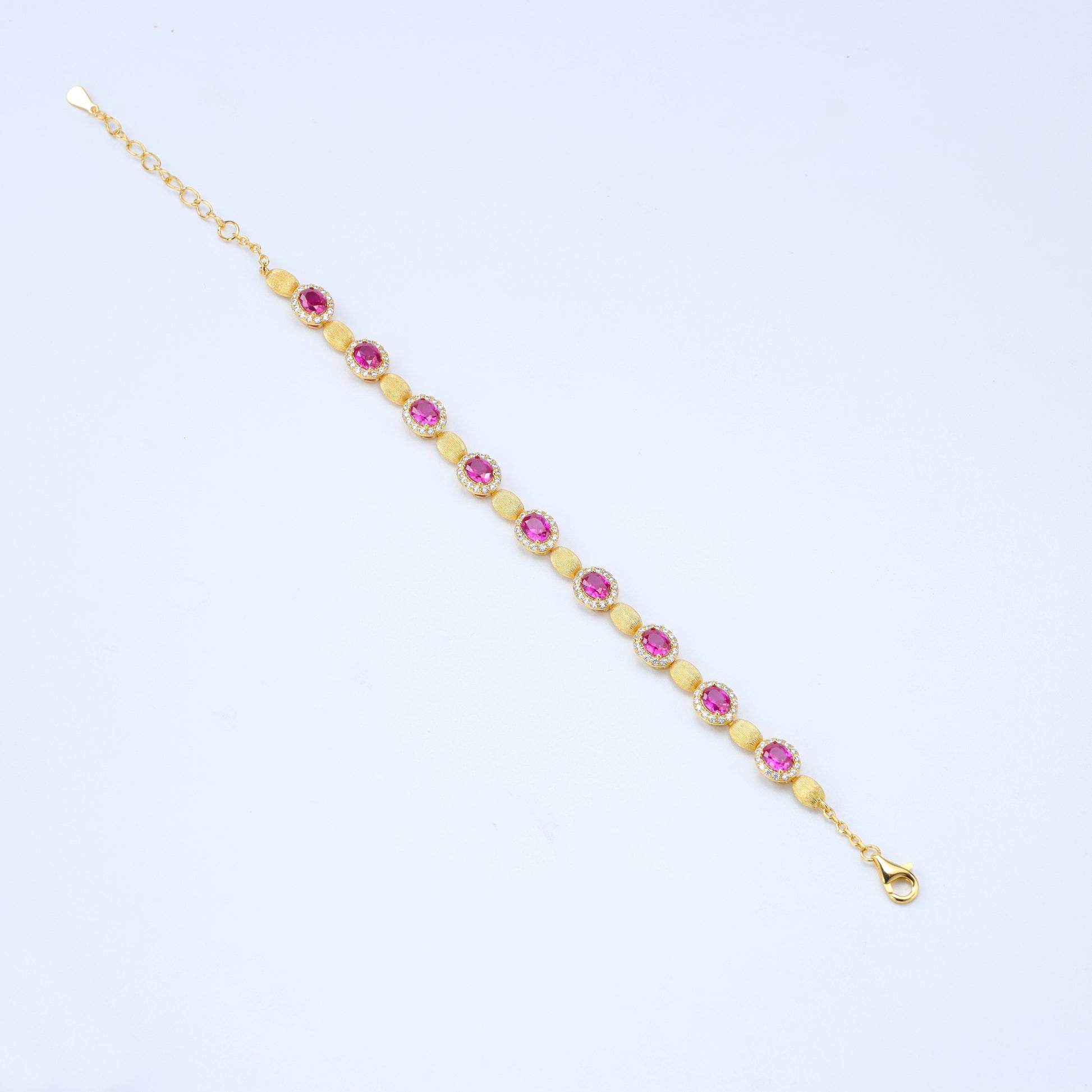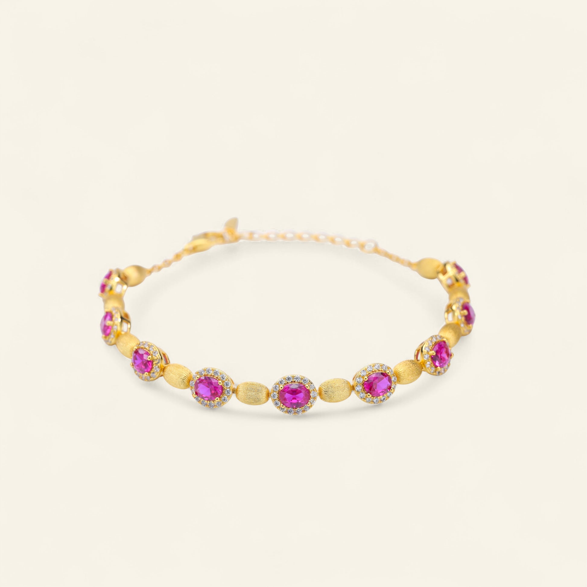 Add a touch of elegance to your look with this exquisite 24K gold plated bracelet. Designed with a luxurious brushed finish, it features brilliant oval-cut lab-created ruby stones, each framed with sparkling zircon accents. The combination of vibrant red and golden tones creates a striking contrast, making this bracelet a true statement piece. Perfect for both daily wear and special occasions, it offers timeless sophistication and long-lasting shine.