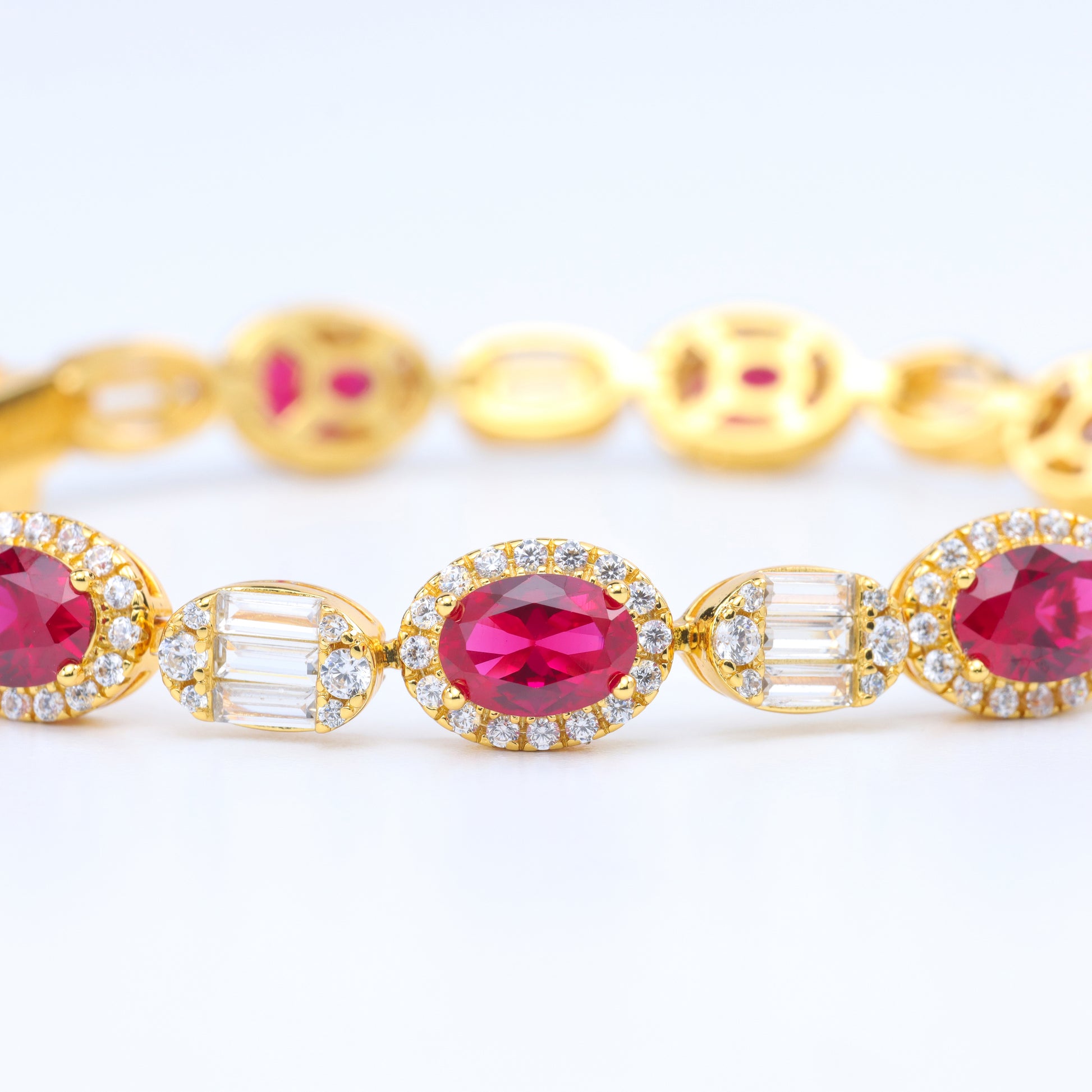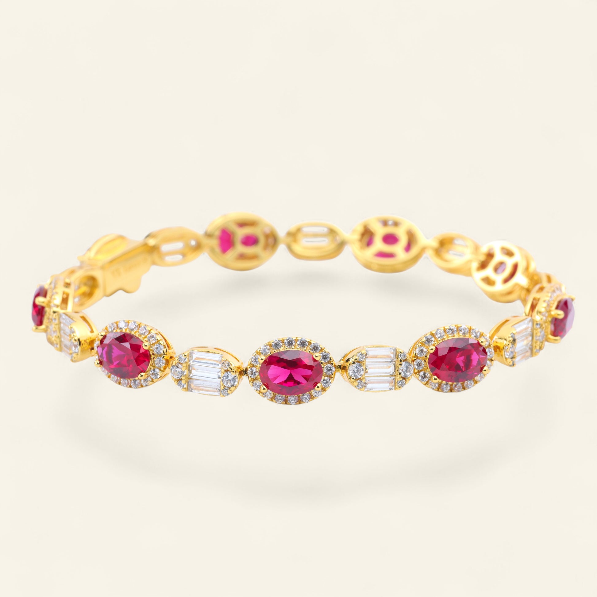 This exquisite bracelet is a true statement of elegance and passion. Crafted with a 24K gold-plated base, it features vibrant oval-cut artificial rubies that radiate rich and captivating color. Each ruby is delicately surrounded by dazzling zircon stones, while baguette-cut zircons add a touch of modern refinement. The combination of fiery rubies and sparkling stones creates a perfect balance of luxury and sophistication, making this piece a timeless treasure for any jewelry collection.