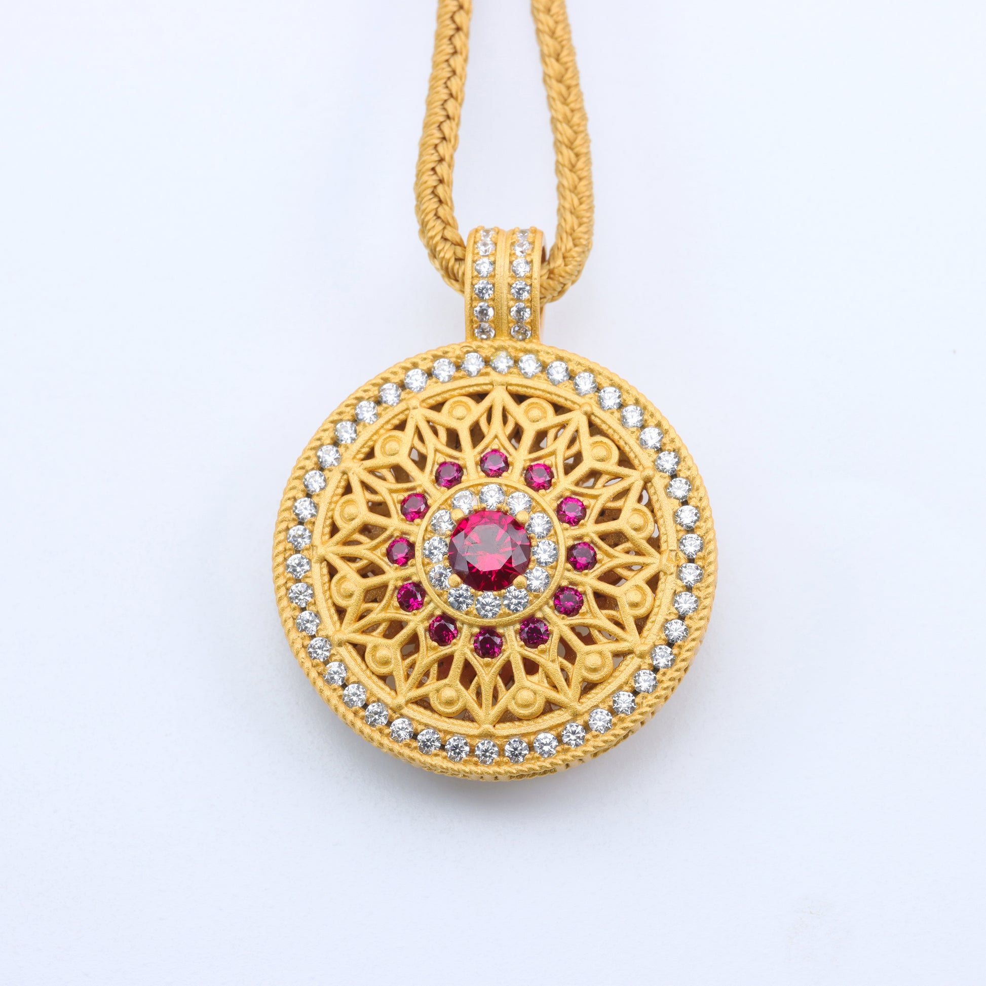 At the center lies a vivid, artificial ruby with rich color and brilliance, surrounded by a circle of alternating rubies and sparkling zircon stones. The outer ring is further adorned with dazzling zircons, creating a breathtaking play of light. The pendant is complemented by a matching woven rope chain in gold tone, highlighting its luxurious and refined style.